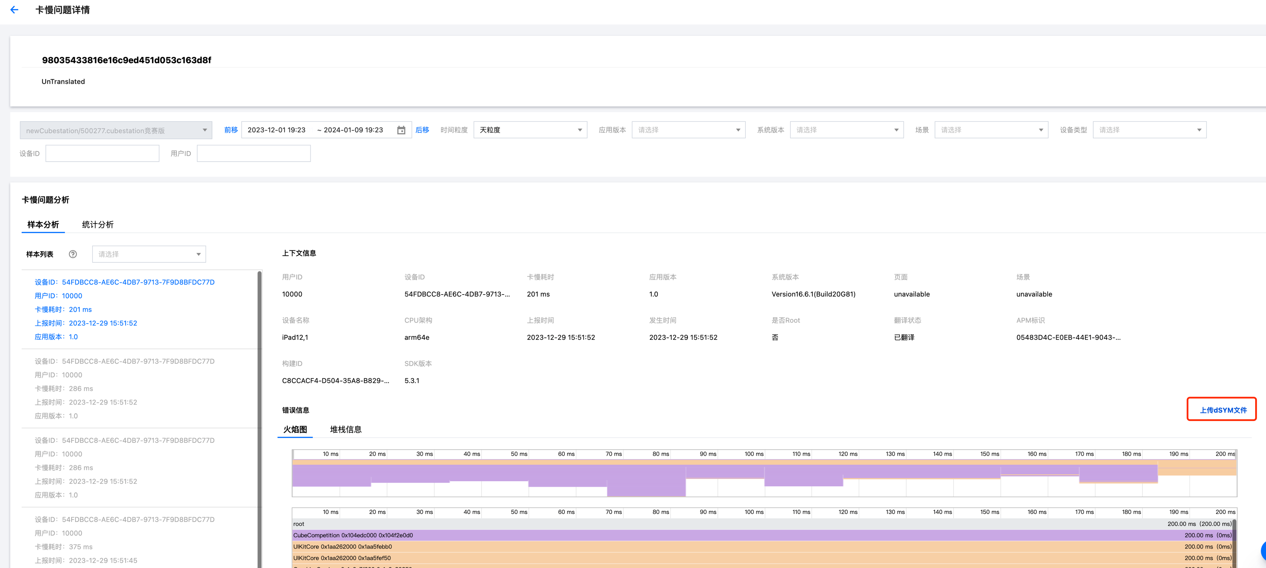 利用已上报的数据个例上传符号表。根据个例页面的构建 ID 找到对应的符号表,可以使用官方 atos 命令翻译个例页面某行堆栈,确认符号表和翻译正常。