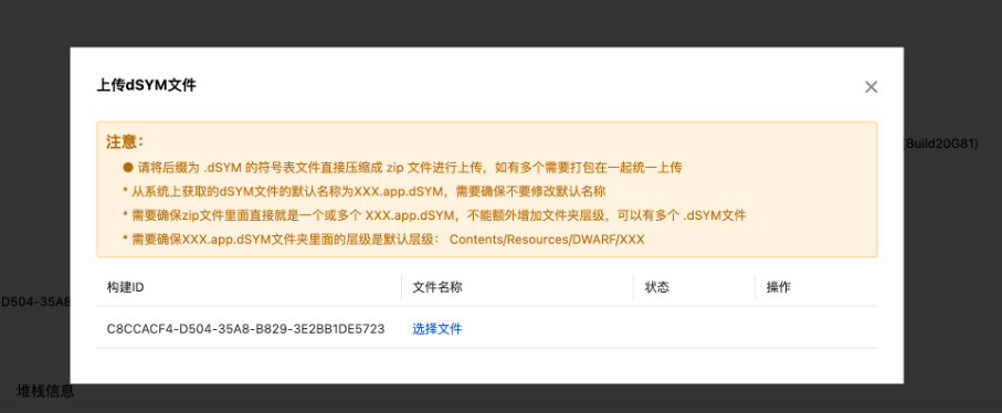 3. 进入符号表上传页面,单击选择文件,然后选择该构建对应的 dSYM 文件即可。
