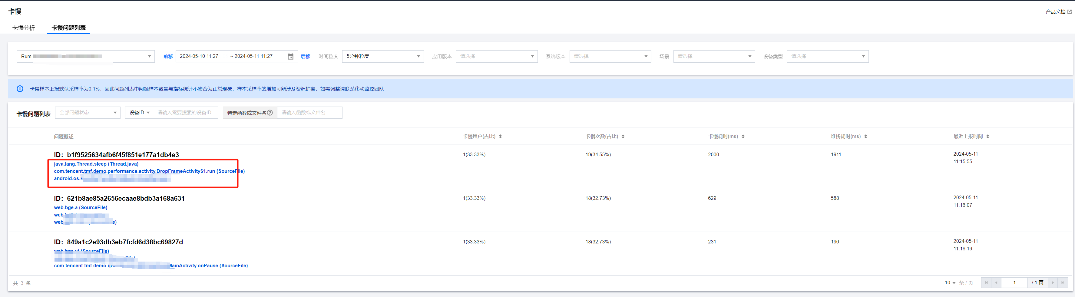 1. 在个例页面中有上传的入口,例如选择卡慢 > 卡慢分析 > 卡慢问题列表,进入详情页面。