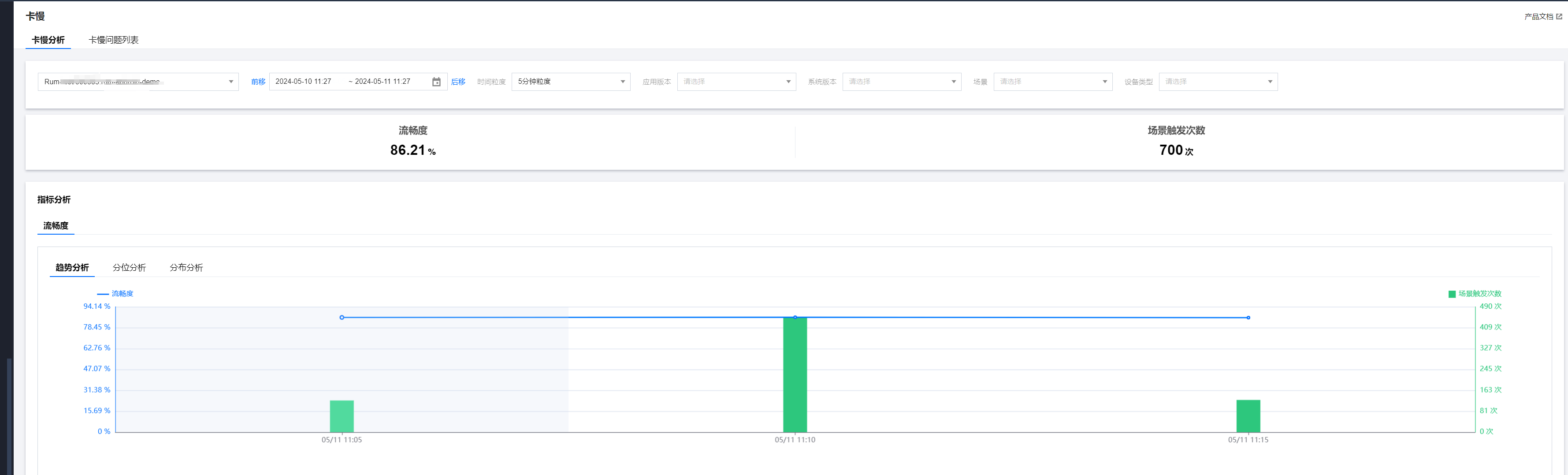 选择需要查看的业务系统、应用、时间范围等分析卡慢问题。