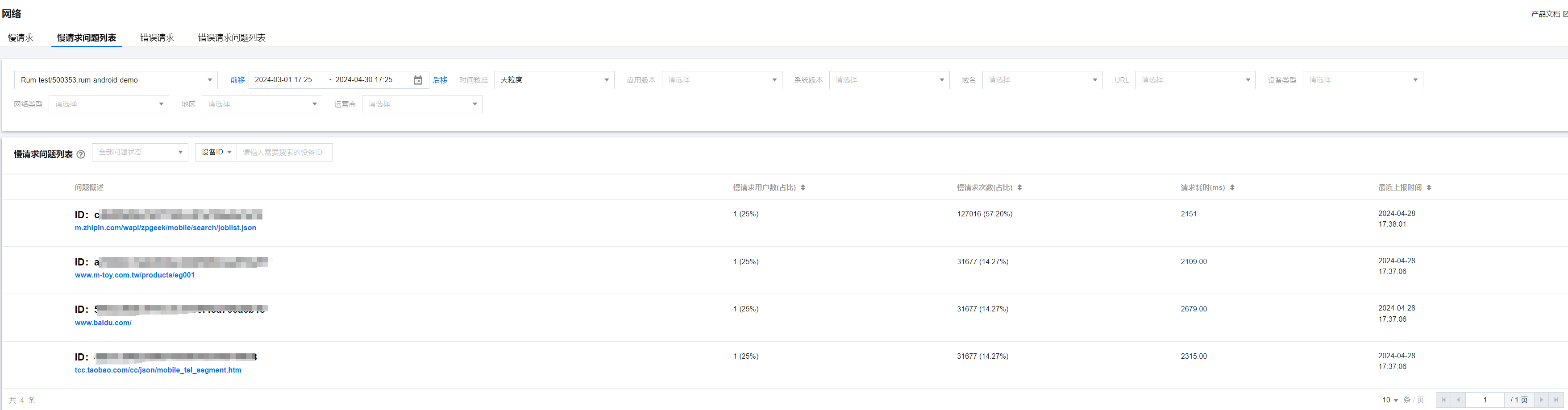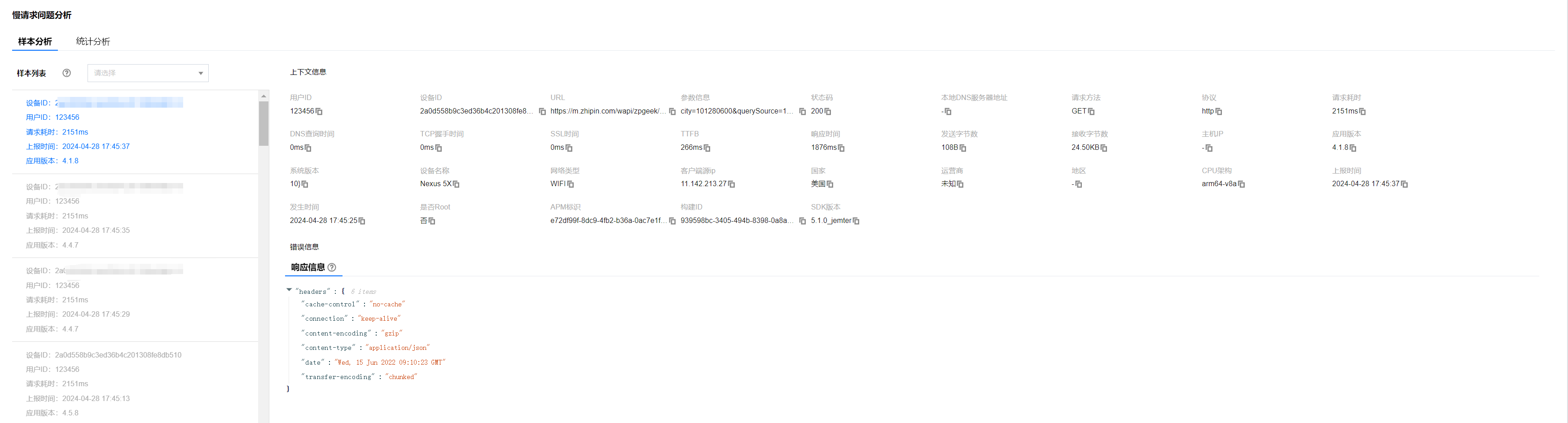 慢请求问题列表展示了所有设备的慢请求问题。您可以根据问题异常类型、问题设备 ID、特定函数或文件名快速筛选相关慢加载设备。您还可以单击问题概述下的相关链接查看慢请求问题详情,定位分析 App 慢请求根因。