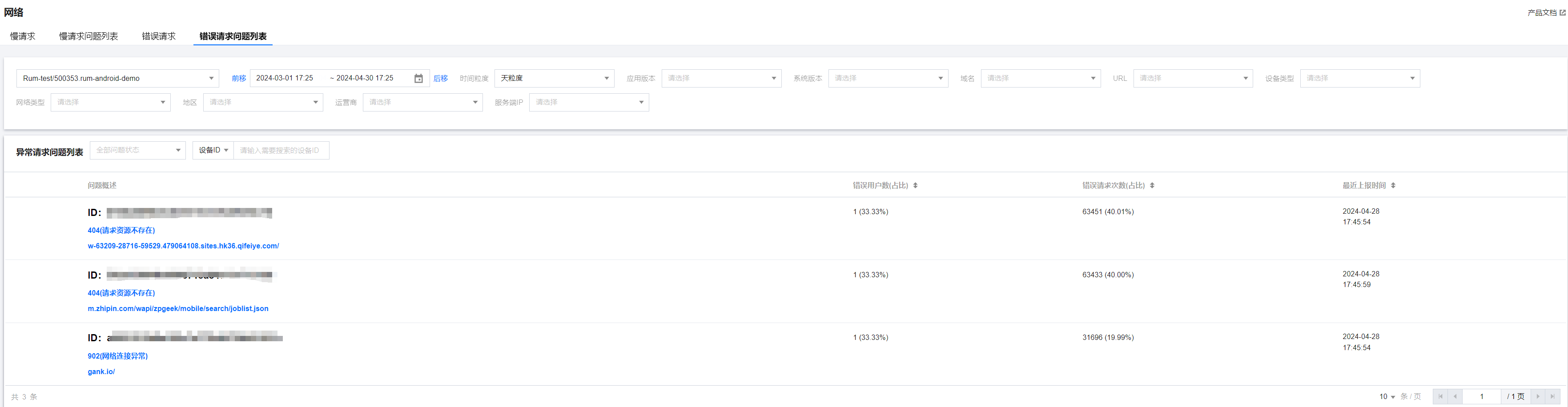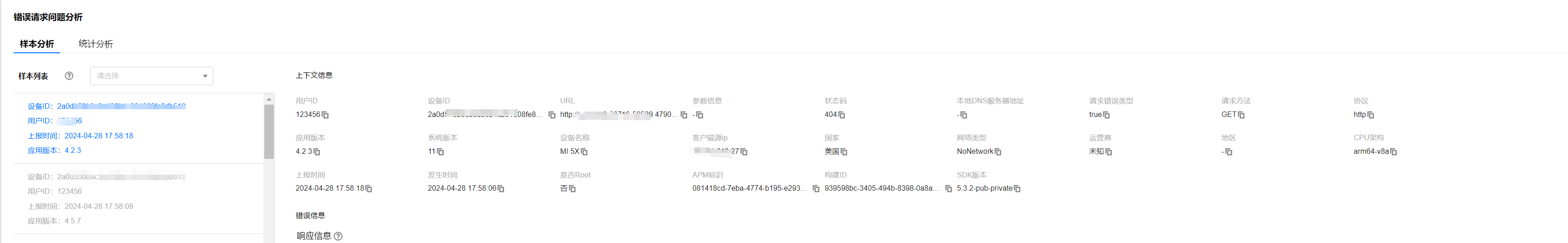 发生 HTTP 请求错误、 DNS 解析错误、无法建连、连接超时等网络方面的错误。将会展示在错误请求列表中,您可以单击问题概述下的相关链接,查看错误请求问题详情,定位分析错误请求根因。
