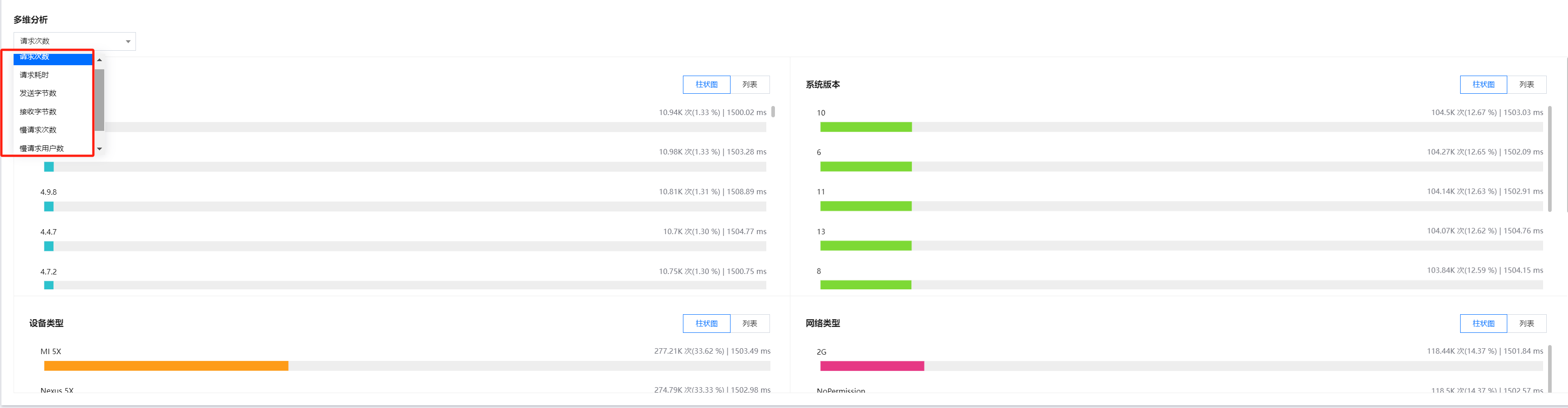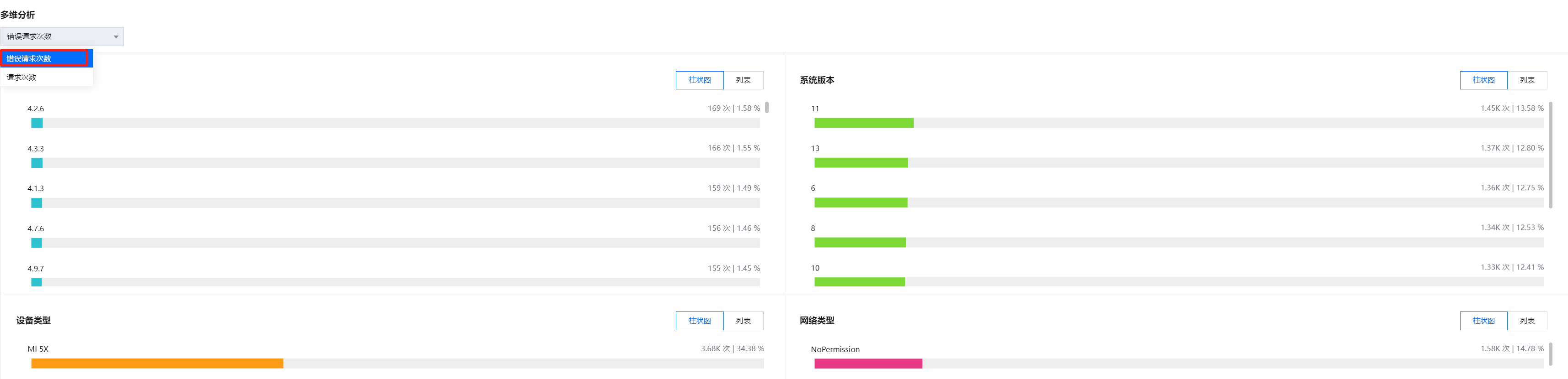 多维分析基于应用版本、系统版本、域名、URL、设备类型、网络类型、地区和运营商等多个维度分析关键指标,便于您聚焦的现象进行针对性的慢请求/错误请求根因分析。