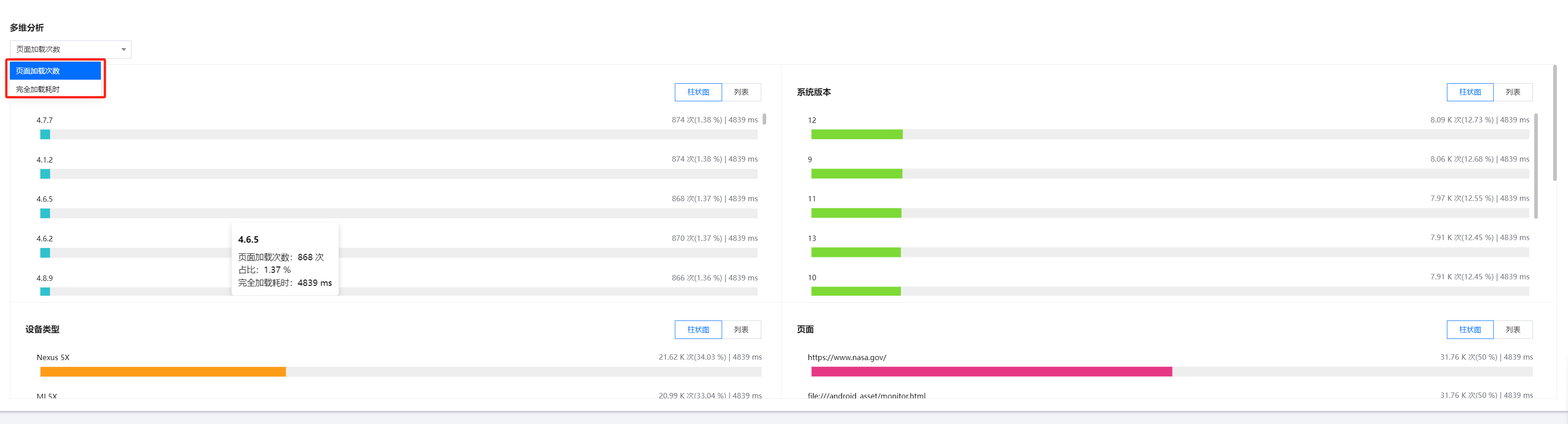 多维分析基于应用版本、系统版本、设备类型、页面、网络类型、运营商和地区等多个维度分析关键指标,便于您聚焦的现象进行针对性的慢加载/ js 错误根因分析。