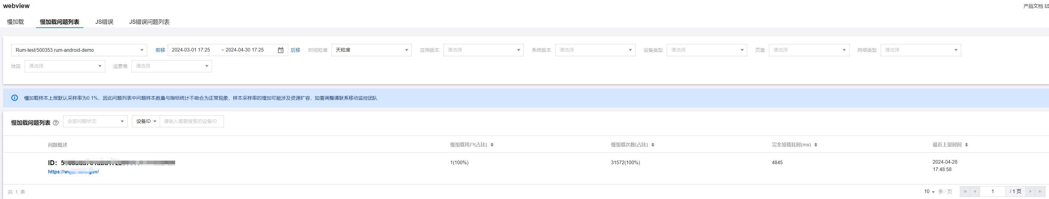 慢加载样本上报默认采样率为0.1%,因此问题列表中问题样本数量与指标统计不吻合为正常现象。