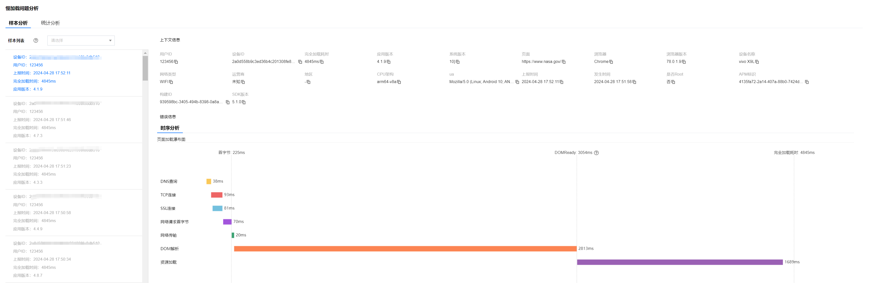 对于每一个页面加载样本,页面完全加载时间大于3500ms 为慢加载,这些慢加载样本会显示在问题列表中。