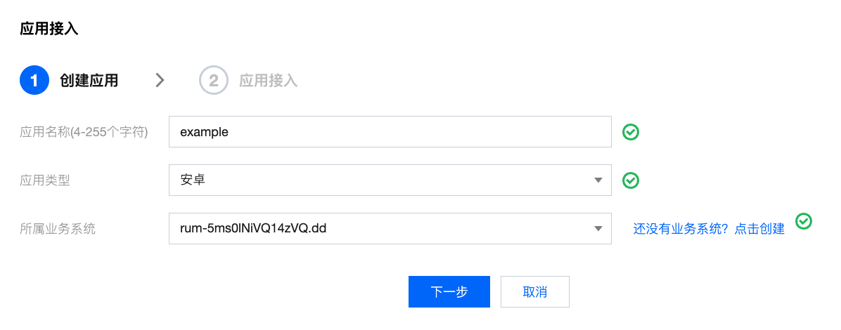 3. 单击应用接入,填写应用名称、选择 Android 或 IOS 应用类型和所属业务系统,然后单击下一步。