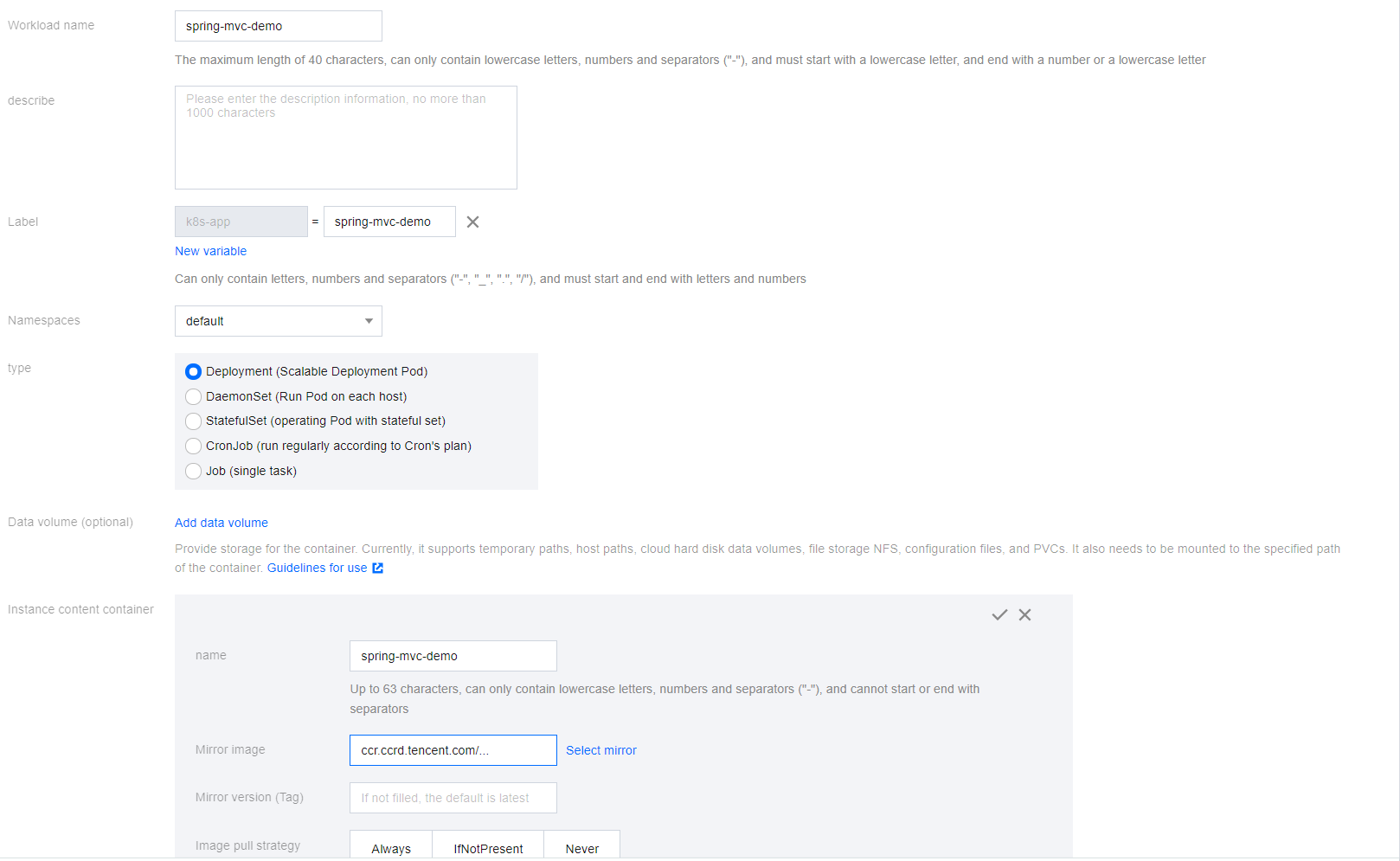 namespace、ImageName、镜像版本号。mvn clean packagedocker build . -t ccr.ccs.tencentyun.com/[namespace]/[ImageName]:[镜像版本号]docker push ccr.ccs.tencentyun.com/[namespace]/[ImageName]:[镜像版本号]