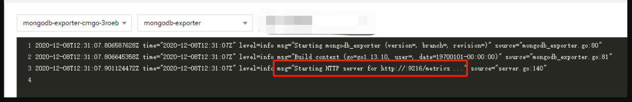 2. 单击日志页签,可以查看到 Exporter 成功启动并暴露对应的访问地址,如下图所示:
