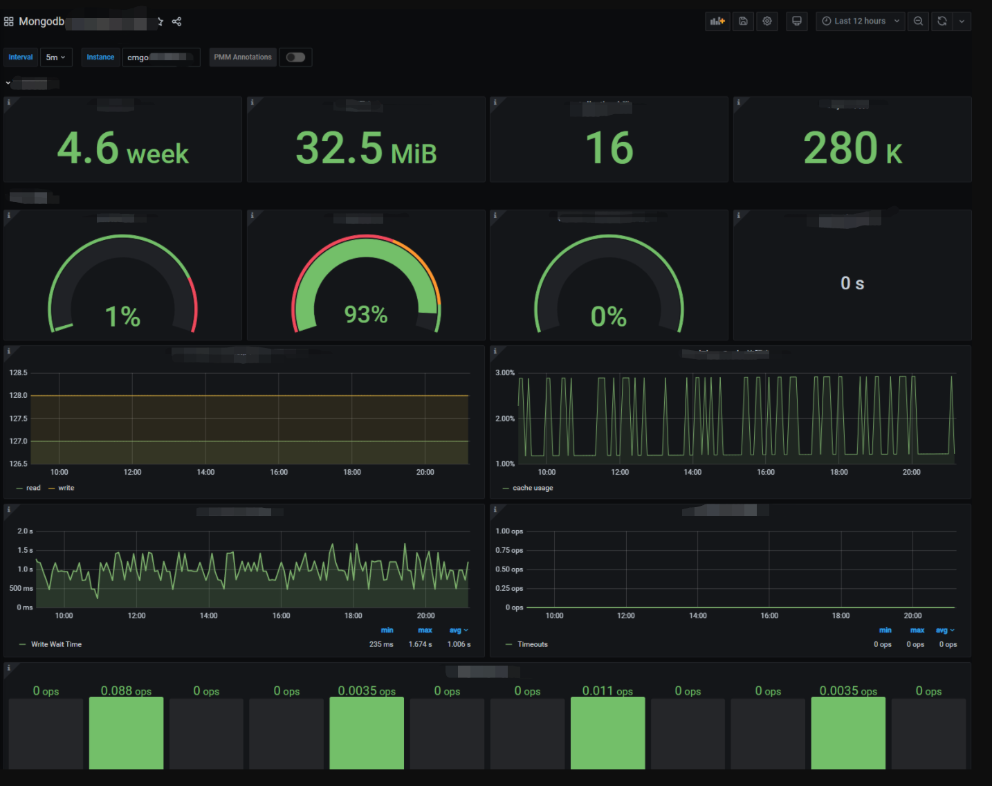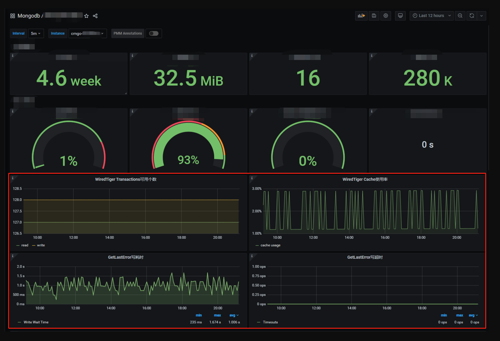 需检查 Cache 使用率是否过高、Transactions 可用个数是否为0,可以通过 Grafana 大盘 MongoDB 详情/核心指标/ WiredTiger Transactions 可用个数| WiredTiger Cache 使用率| GetLastError 写耗时| GetLastError 写超时指标排查。