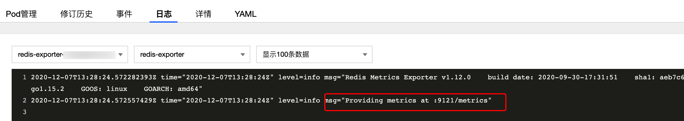 apiVersion: apps/v1kind: Deploymentmetadata:labels:k8s-app: redis-exporter # 根据业务需要调整成对应的名称,建议加上 Redis 实例的信息,如crs-66e112fp-redis-exportername: redis-exporter # 根据业务需要调整成对应的名称,建议加上 Redis 实例的信息,如crs-66e112fp-redis-exporternamespace: redis-test # 选择一个适合的 namespace 来部署 exporter,如果没有需要新建一个 namespacespec:replicas: 1selector:matchLabels:k8s-app: redis-exporter # 根据业务需要调整成对应的名称,建议加上 Redis 实例的信息,如crs-66e112fp-redis-exportertemplate:metadata:labels:k8s-app: redis-exporter # 根据业务需要调整成对应的名称,建议加上 Redis 实例的信息,如crs-66e112fp-redis-exporterspec:containers:- env:- name: REDIS_ADDRvalue: ip:port # 对应 Redis 的 ip:port- name: REDIS_PASSWORDvalueFrom:secretKeyRef:name: redis-secret-testkey: passwordimage: ccr.ccs.tencentyun.com/rig-agent/redis-exporter:v1.32.0imagePullPolicy: IfNotPresentname: redis-exporterports:- containerPort: 9121name: metric-port # 这个名称在配置抓取任务的时候需要securityContext:privileged: falseterminationMessagePath: /dev/termination-logterminationMessagePolicy: FilednsPolicy: ClusterFirstimagePullSecrets:- name: qcloudregistrykeyrestartPolicy: AlwaysschedulerName: default-schedulersecurityContext: {}terminationGracePeriodSeconds: 30