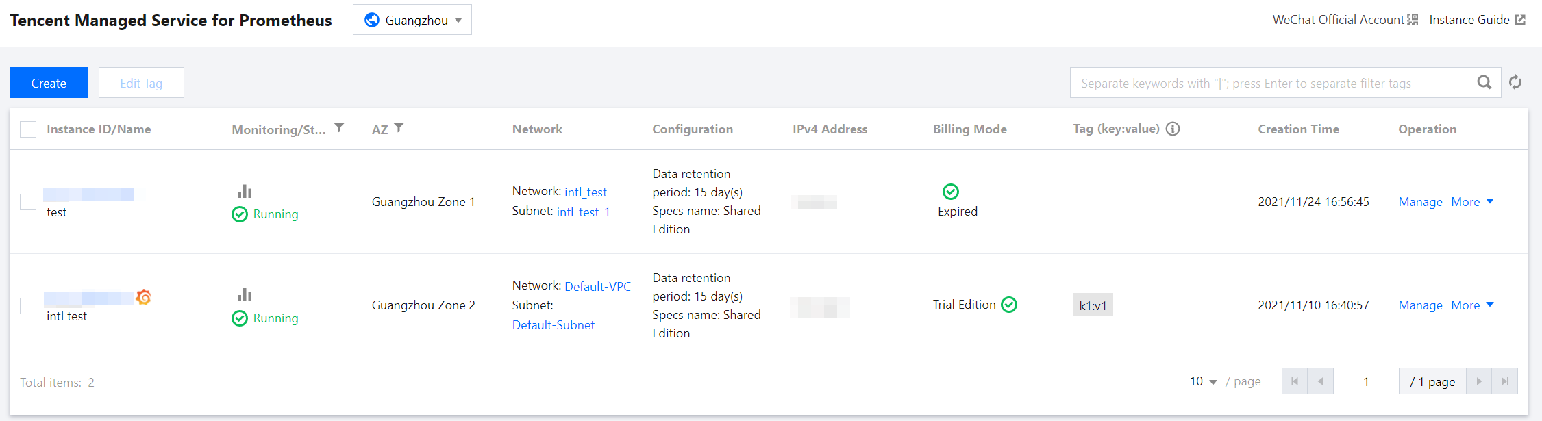 可用区 | 支持用户多个可用区过滤,切换地域之后显示该地域下的 Prometheus 对应的可用区,同时也支持在列表头进行快速过滤。 |