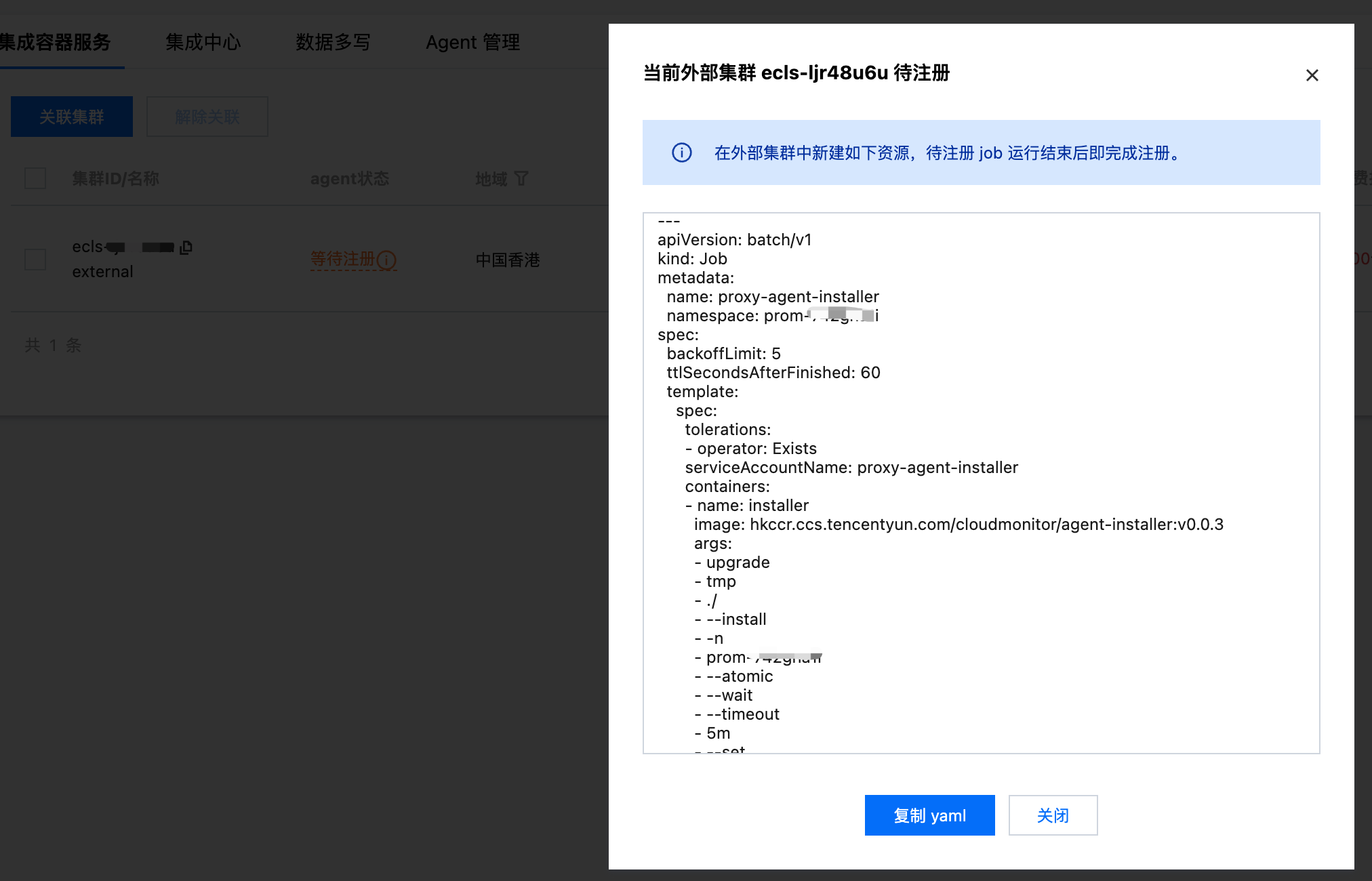 初始化成功后,点击等待注册弹出 Job 安装 yaml。Job 执行 helm 命令安装采集相关组件,组件和权限详细说明参见 TKE 集群内安装组件说明。Job 主要参数如下: |