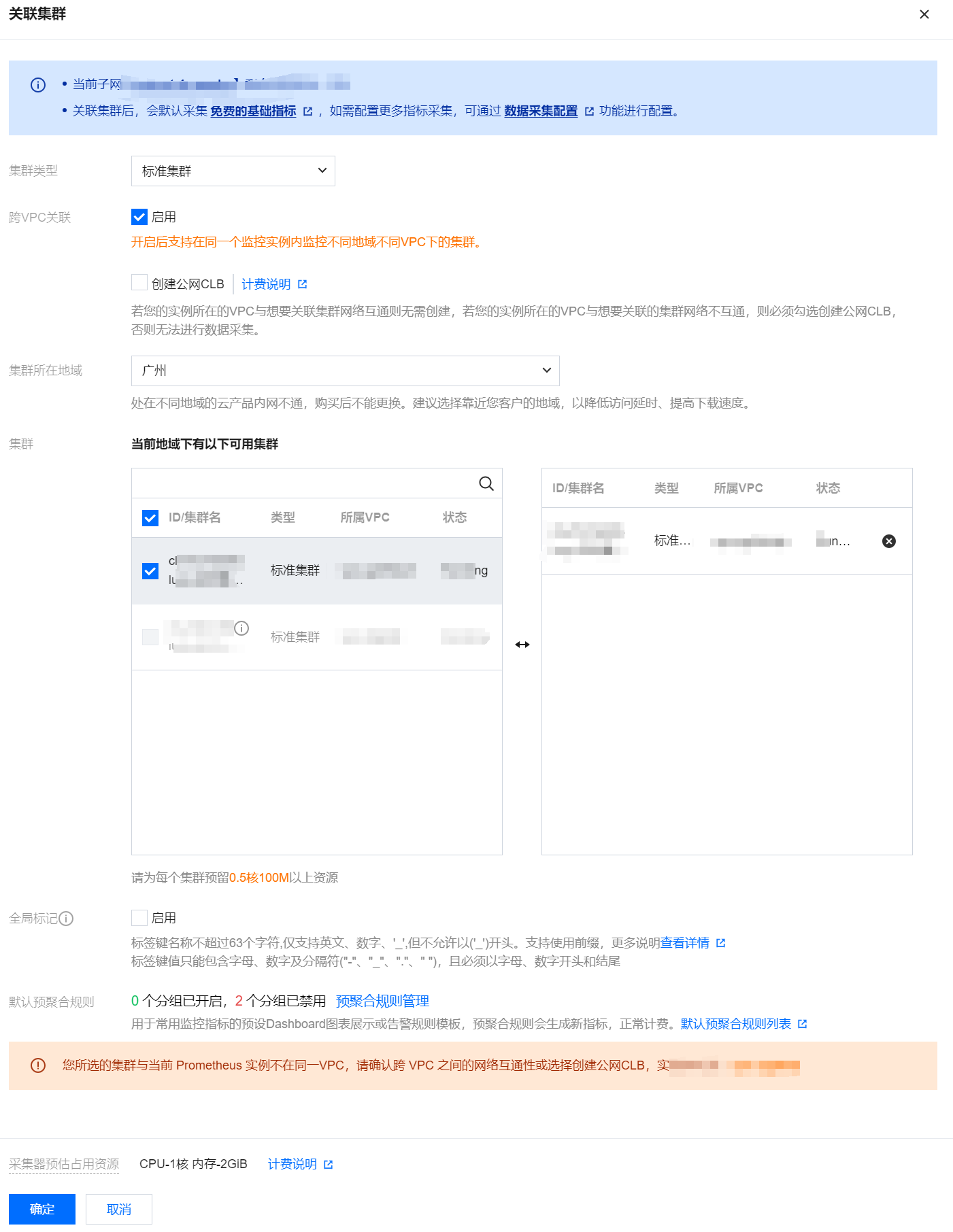 跨 VPC 关联:开启后支持在同一个监控实例内监控不同地域不同VPC下的集群。