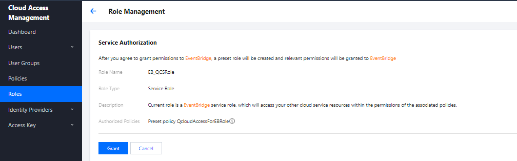 EB_QCSRole,如果没有,请按照 主账号授权 授权操作完成授权,否则子用户无法正常使用 EB 控制台和通过 EB 调用其他云上资源。
