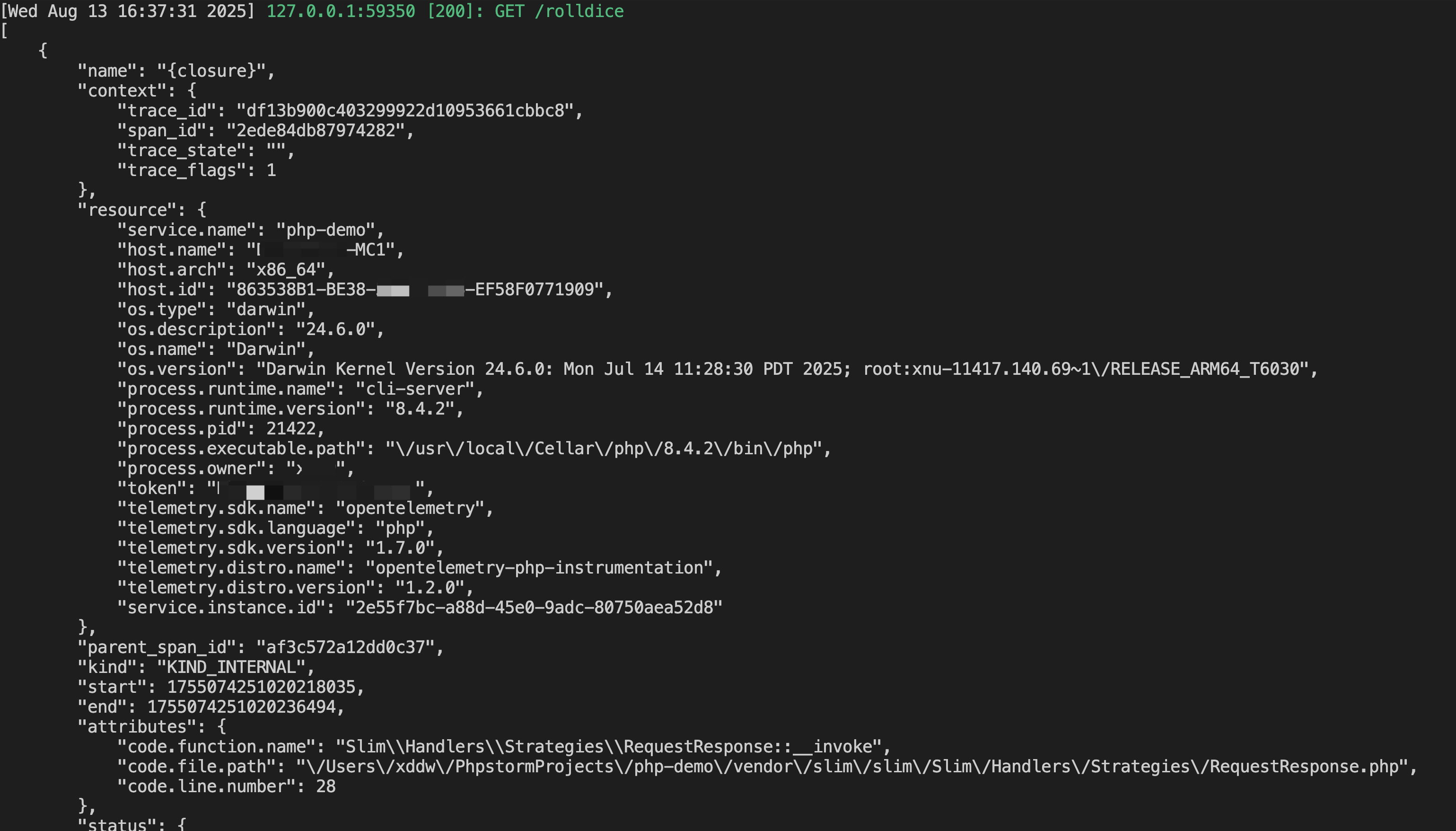 OTEL_TRACES_EXPORTER=console ,重启 PHP 项目,发送请求到该 PHP 服务。