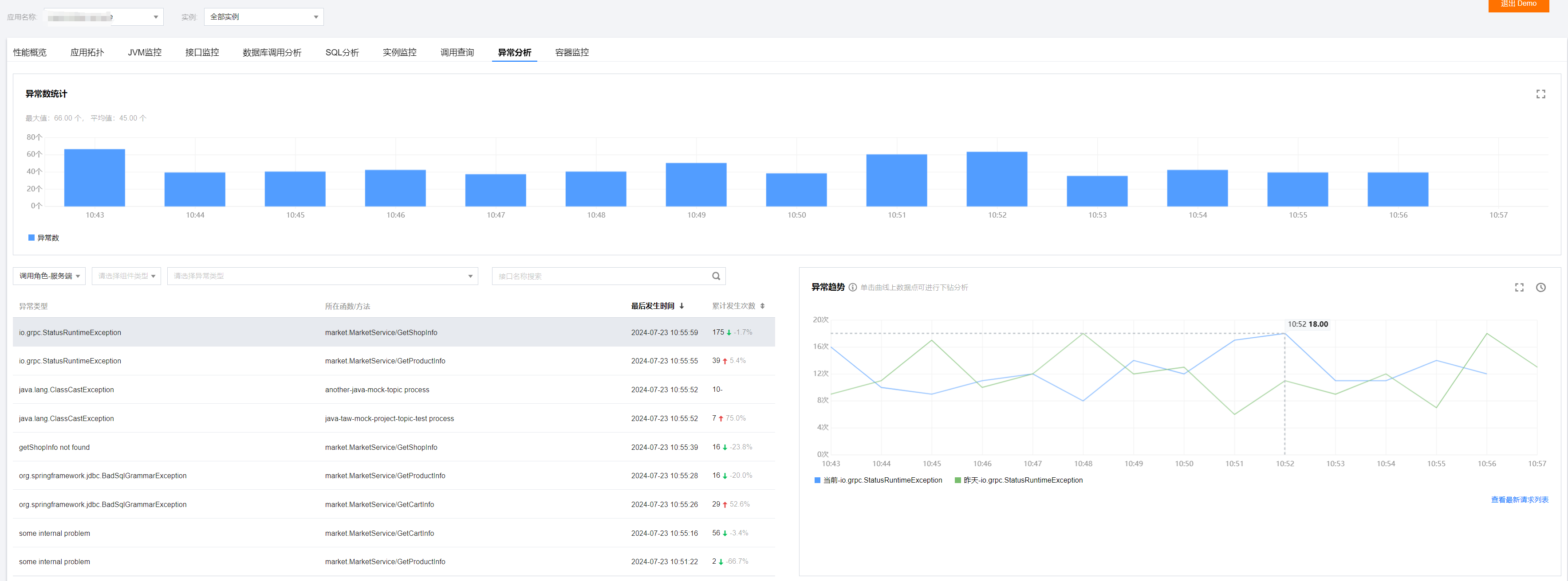 在异常监控页面左侧所选时间内的所有异常,包括服务异常类型、接口、异常发生次数等信息。