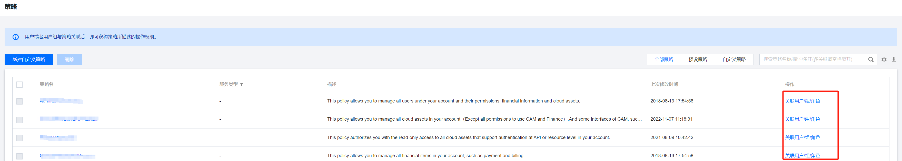 1. 使用主账号或拥有 QcloudCamFullAccess 权限的子账号进入访问控制 > 策略。 2. 进入策略管理页,在策略名称搜索框中输入对应的策略名称。