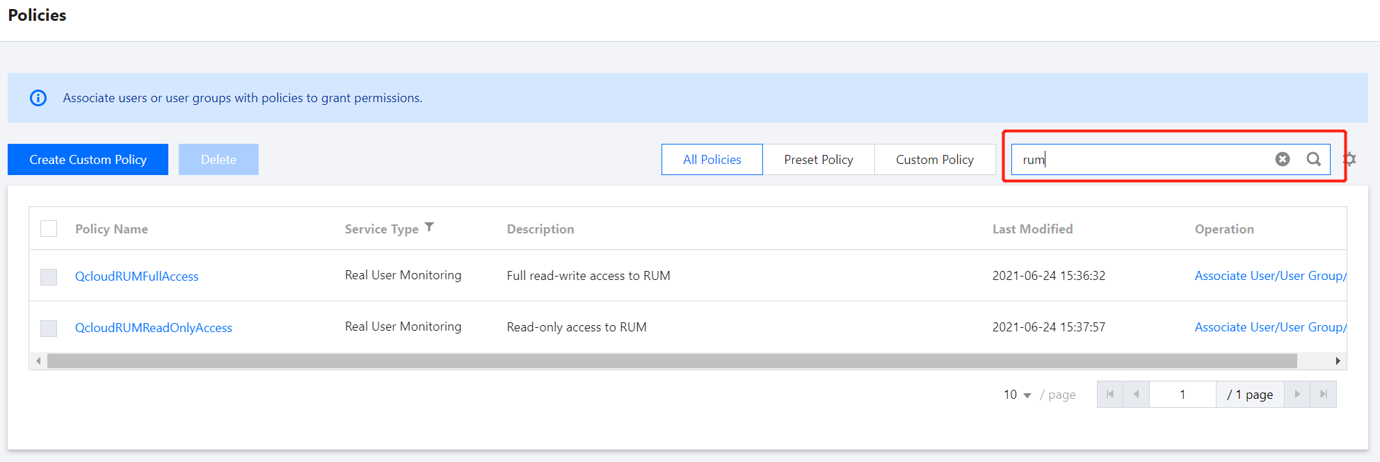 前端性能监控为您创建默认策略 QcloudRUMFullAccess(前端性能监控(RUM)全读写访问权限)和 QcloudRUMReadOnlyAccess(前端性能监控(RUM)只读访问权限),您可以通过搜索策略名称快速进行默认策略授权。也可以对自定义策略进行授权。授权成功后,子账号才能正常访问相关资源。