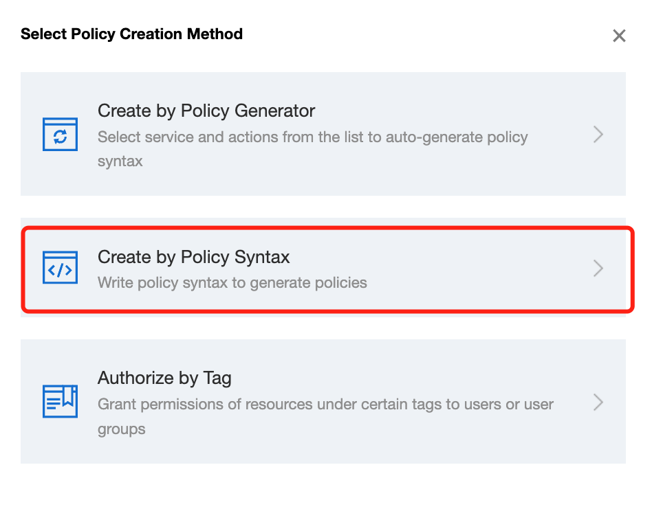 1. 使用主账号或拥有 QcloudCamFullAccess 权限的子账号进入访问控制 > 策略。 2. 单击新建自定义策略 > 按策略语法创建,选择空白模板。根据 策略语法 完成策略编辑。