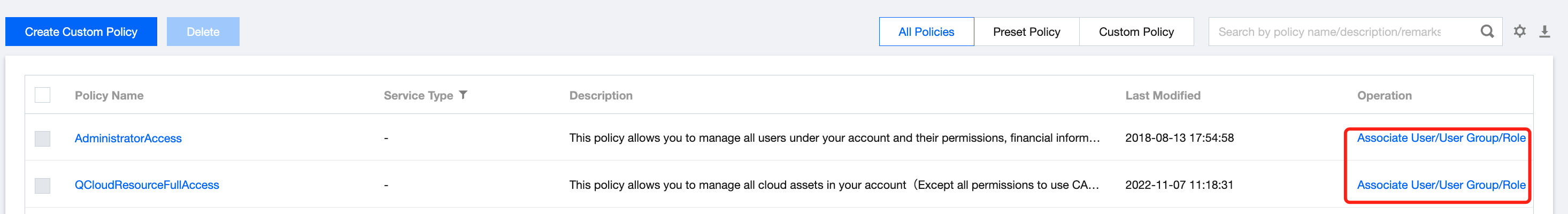 1. 使用主账号或拥有 QcloudCamFullAccess 权限的子账号进入访问控制 > 策略。 2. 进入策略管理页,在策略名称搜索框中输入对应的策略名称。