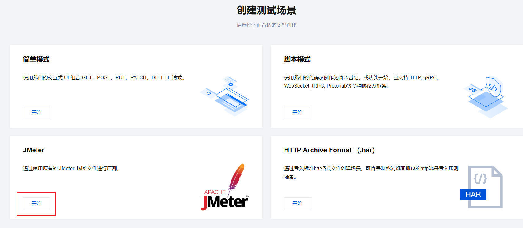 3. 单击新建场景,在新建测试场景页面选择 JMeter 类型的测试场景。