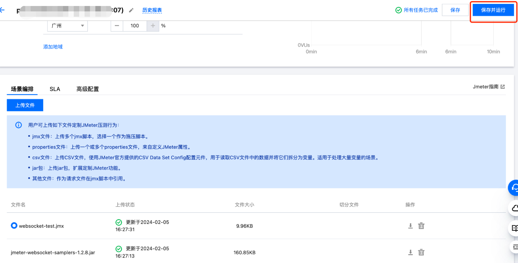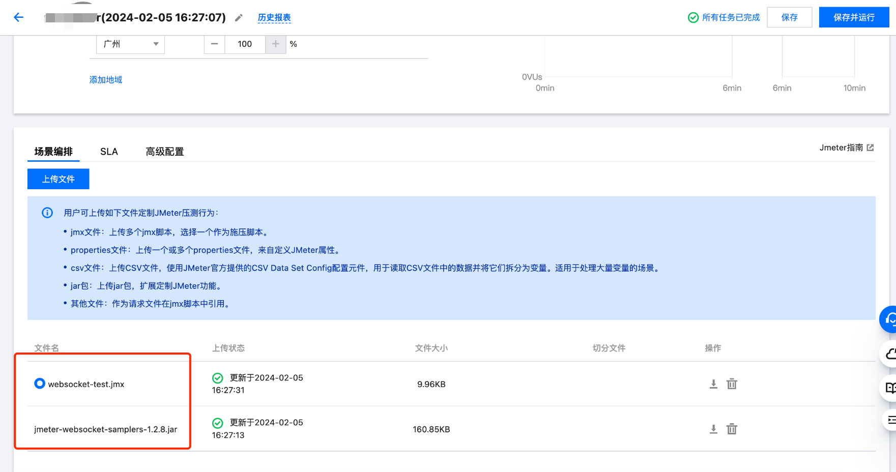 2. 本地调试成功后,将对应的 JMX 脚本和 WebSocket 插件以及其他需要的文件上传到控制台。