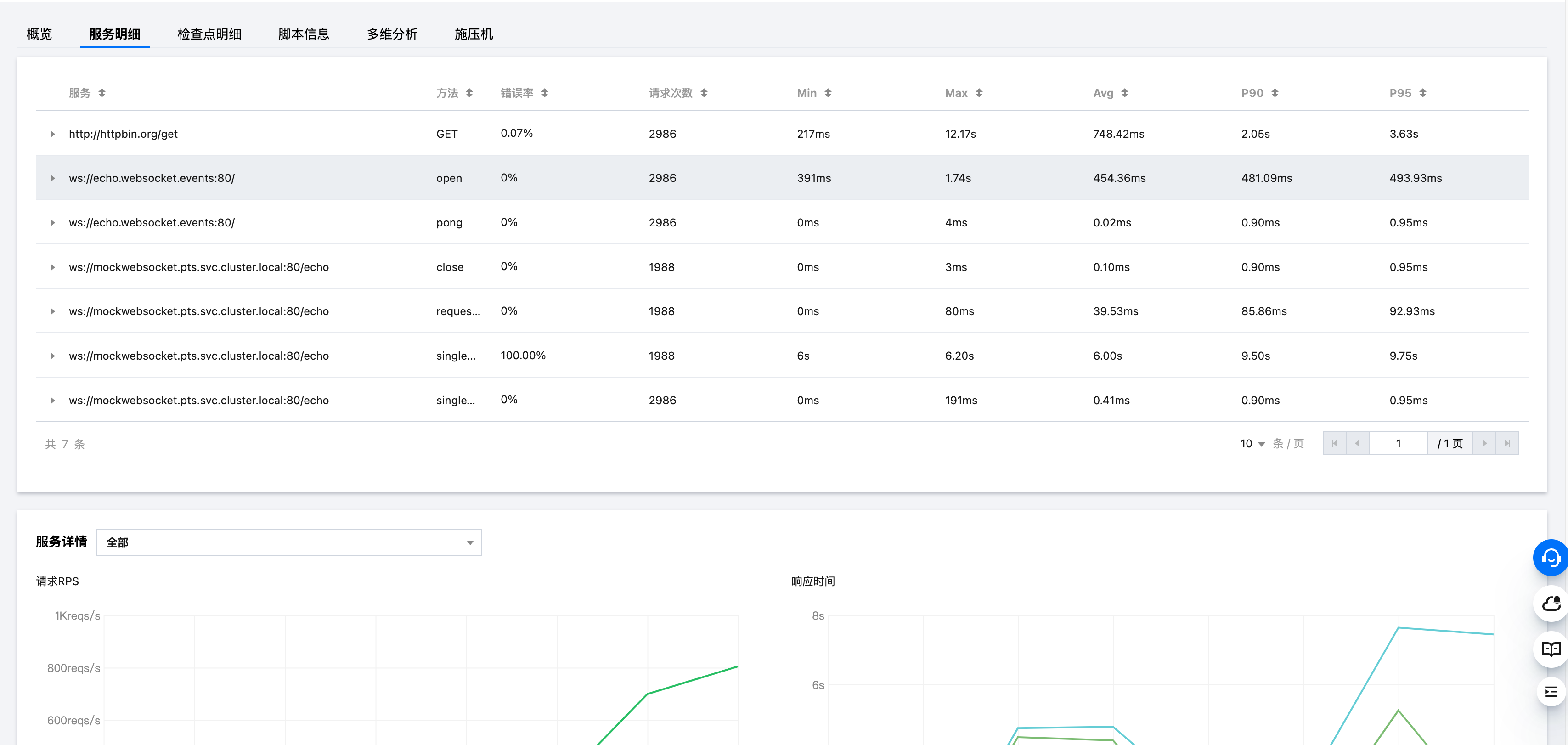 云压测对 WebSocket 插件中各采样器的结果进行了埋点,压测过程中在控制台上可以看到对应不同方法的压测数据,可以根据业务需要进行查看。