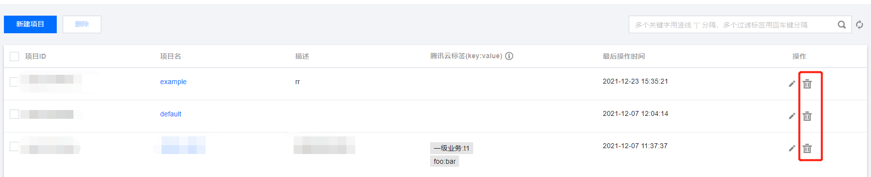 在新建项目管理页,找到需要删除的项目,在操作列中单击