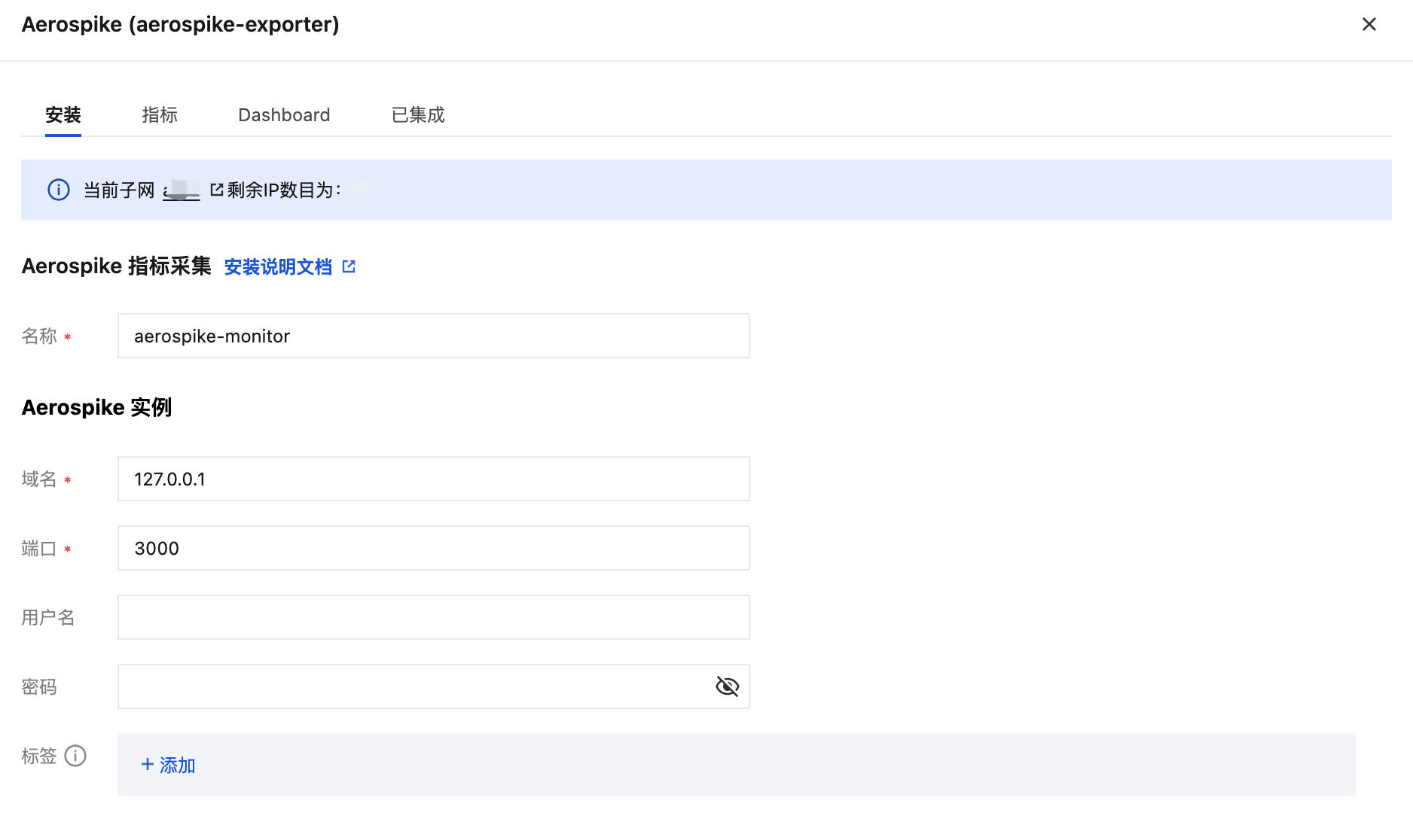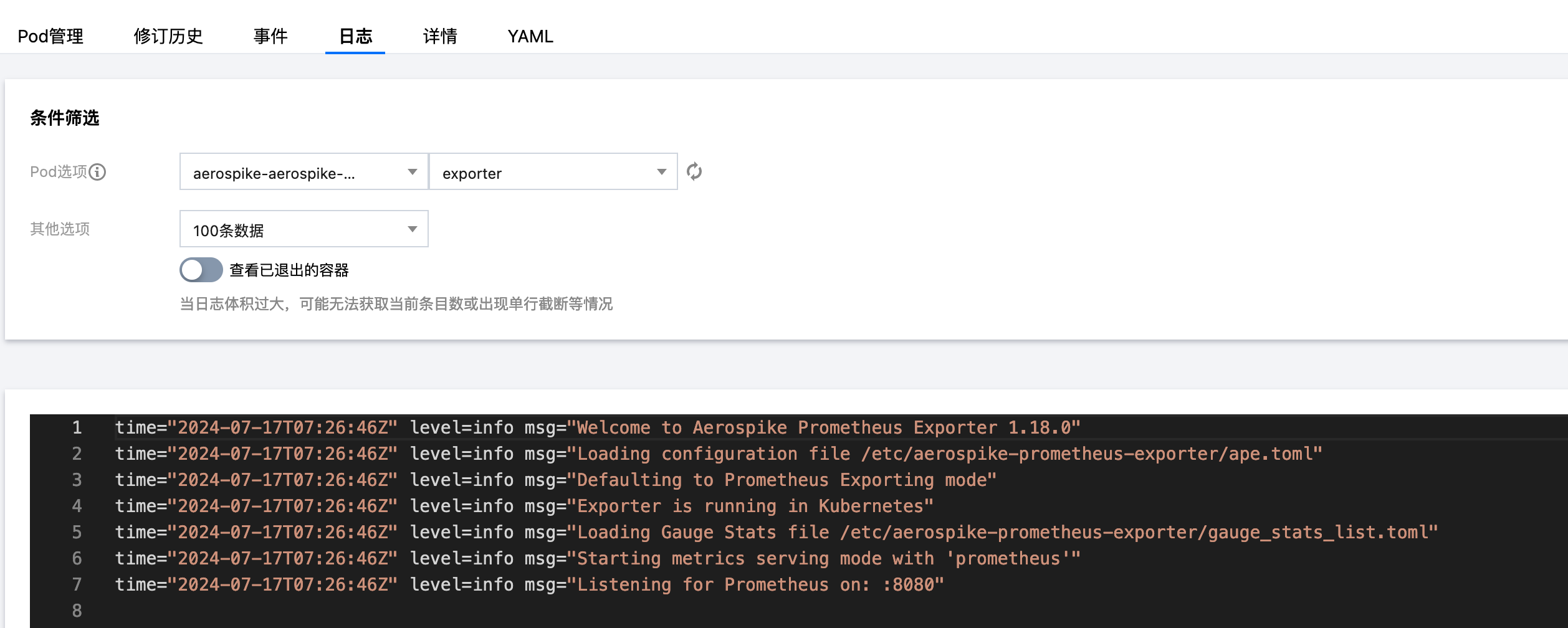 PodMonitors 来定义 Prometheus 抓取任务,YAML 配置示例如下:apiVersion: monitoring.coreos.com/v1kind: PodMonitormetadata:name: aerospike-exporter # 填写一个唯一名称namespace: cm-prometheus # 按量实例: 集群的 namespace; 包年包月实例(已停止售卖): namespace 固定,不要修改spec:podMetricsEndpoints:- interval: 30sport: metric-port # 填写pod yaml中Prometheus Exporter对应的Port的Namepath: /metrics # 填写Prometheus Exporter对应的Path的值,不填默认/metricsrelabelings:- action: replacesourceLabels:- instanceregex: (.*)targetLabel: instancereplacement: 'crs-xxxxxx' # 调整成对应的 Aerospike 实例 IDnamespaceSelector: # 选择要监控 aerospike exporter pod 所在的 namespacematchNames:- aerospike-demoselector: # 填写要监控pod的Label值,以定位目标podmatchLabels:k8s-app: aerospike-exporter