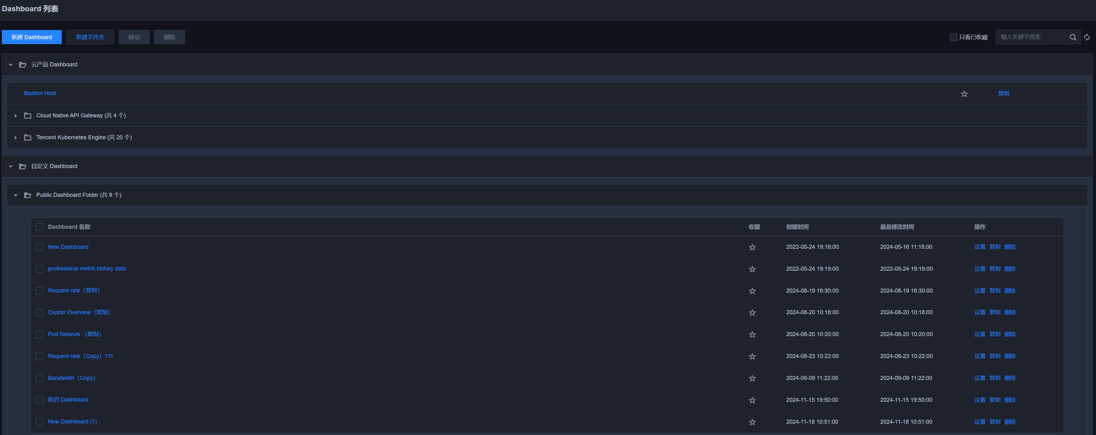 Dashboard 列表:支持查看、复制、收藏和设置默认 Dashboard。