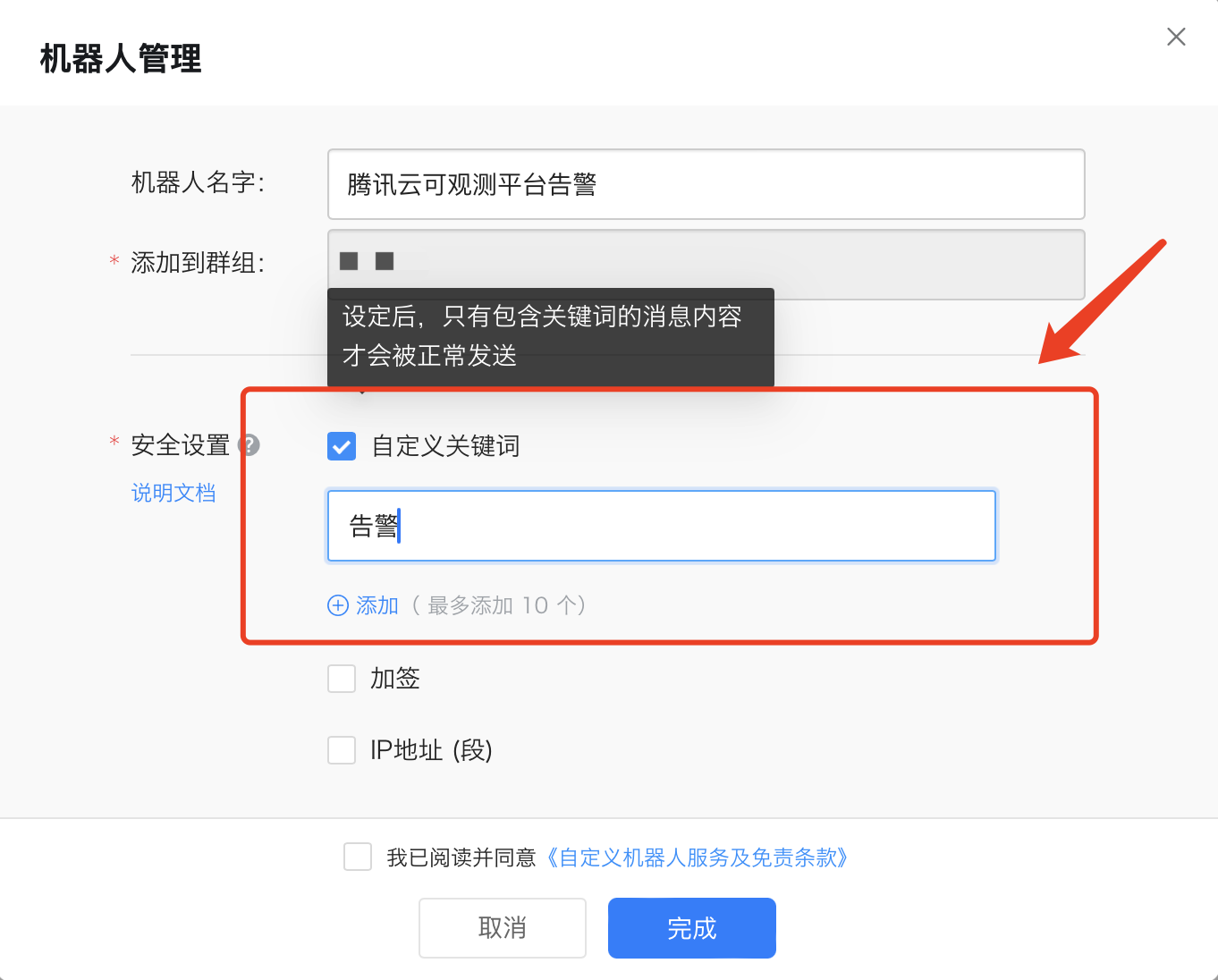 勾选自定义关键词复选框,输入添加关键词,最多可以设置10个关键词,消息中至少包含其中1个关键词才可以发送成功。例如添加了一个自定义关键词:告警,则这个机器人所发送的消息,必须包含告警这个词,才能发送成功。 6. 查看《自定义机器人服务及免责条款》,并勾选我阅读并同意复选框。
