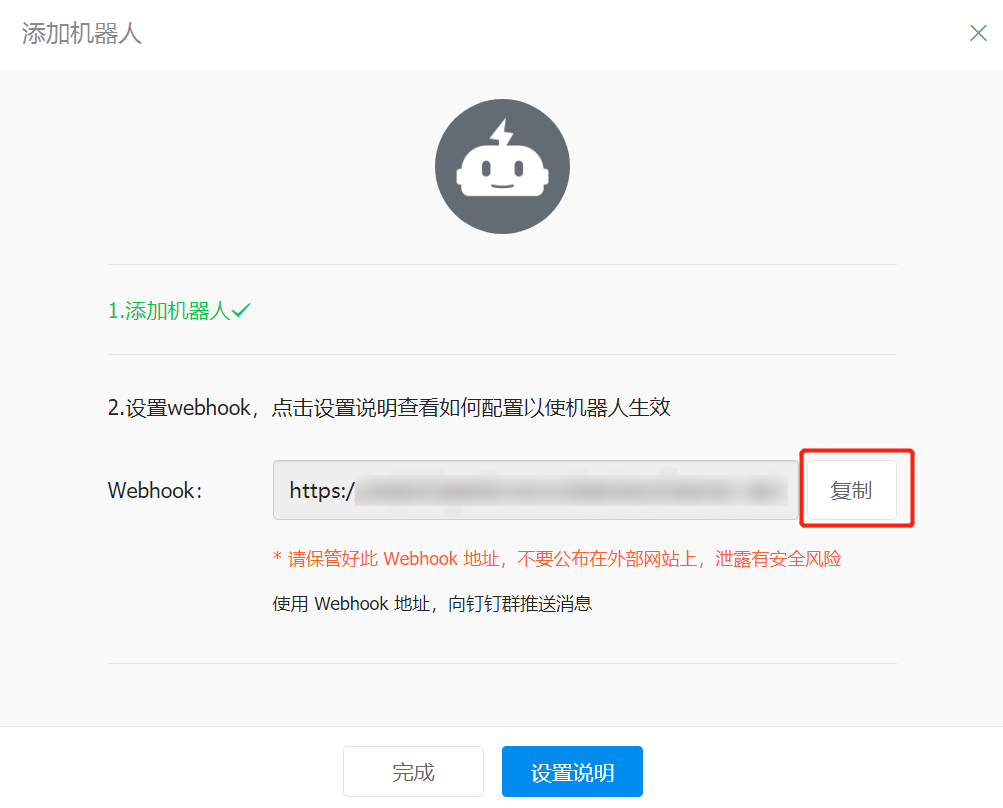 7. 单击完成,在跳转框中复制 Webhook 地址。
