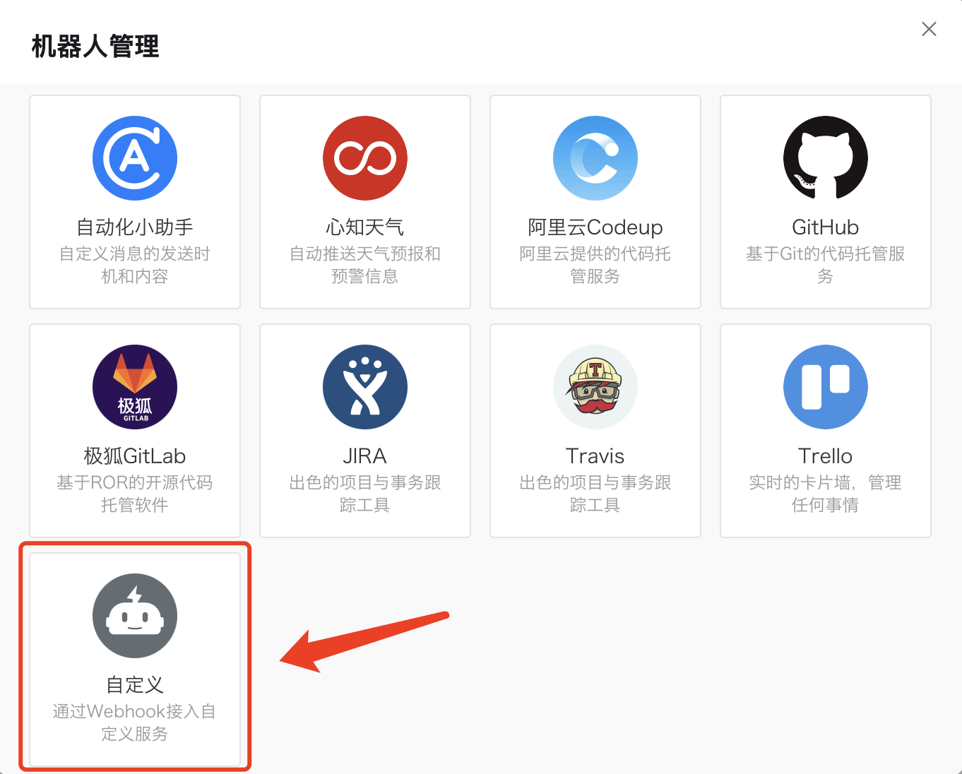 4. 在群机器人弹框中再单击添加机器人,选择自定义机器人。