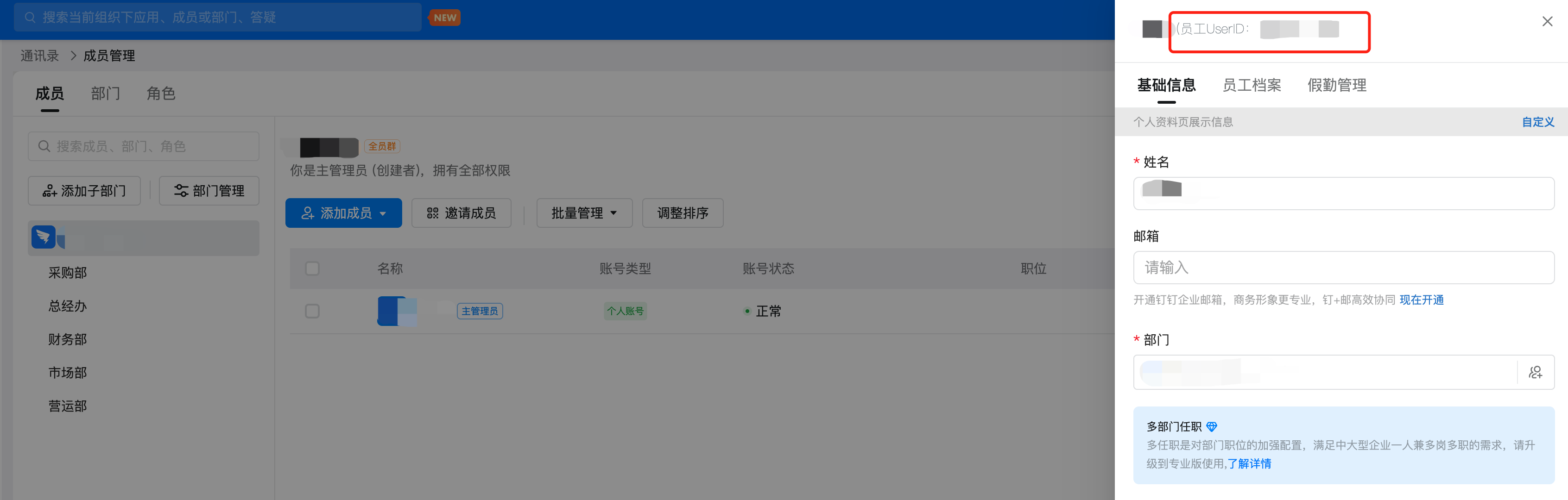 登录 钉钉管理后台,进入通讯录 > 成员管理页面,点击该员工即可查看员工的 userid。