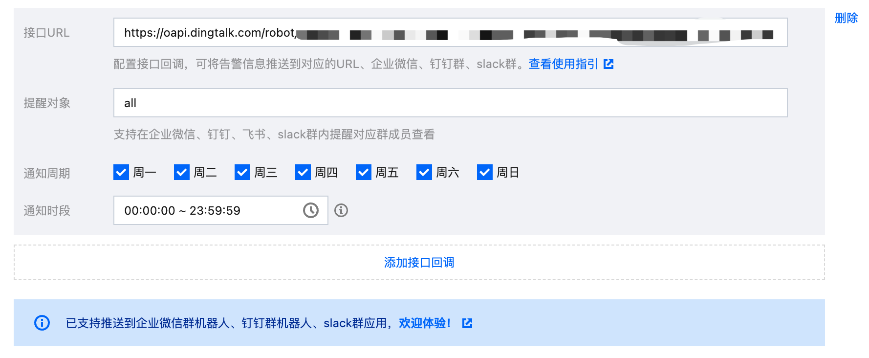 您在钉钉群上新增钉钉机器人的 Webhook 地址,并在告警通知模板配置该地址,即可使用钉钉群接收告警通知。