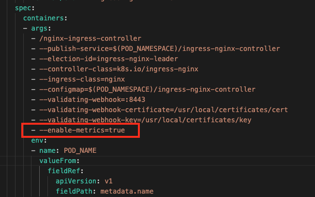 2.2 如果使用 v1.12.0及以上的 ingress-nginx-controller 镜像版本,还需在启动参数中增加开启指标的配置项,需在工作负载 ingress-nginx-controller 的参数设置 spec.template.spec.containers[0].args 中增加配置项 --enable-metrics=true,配置完成后的效果如下图所示: