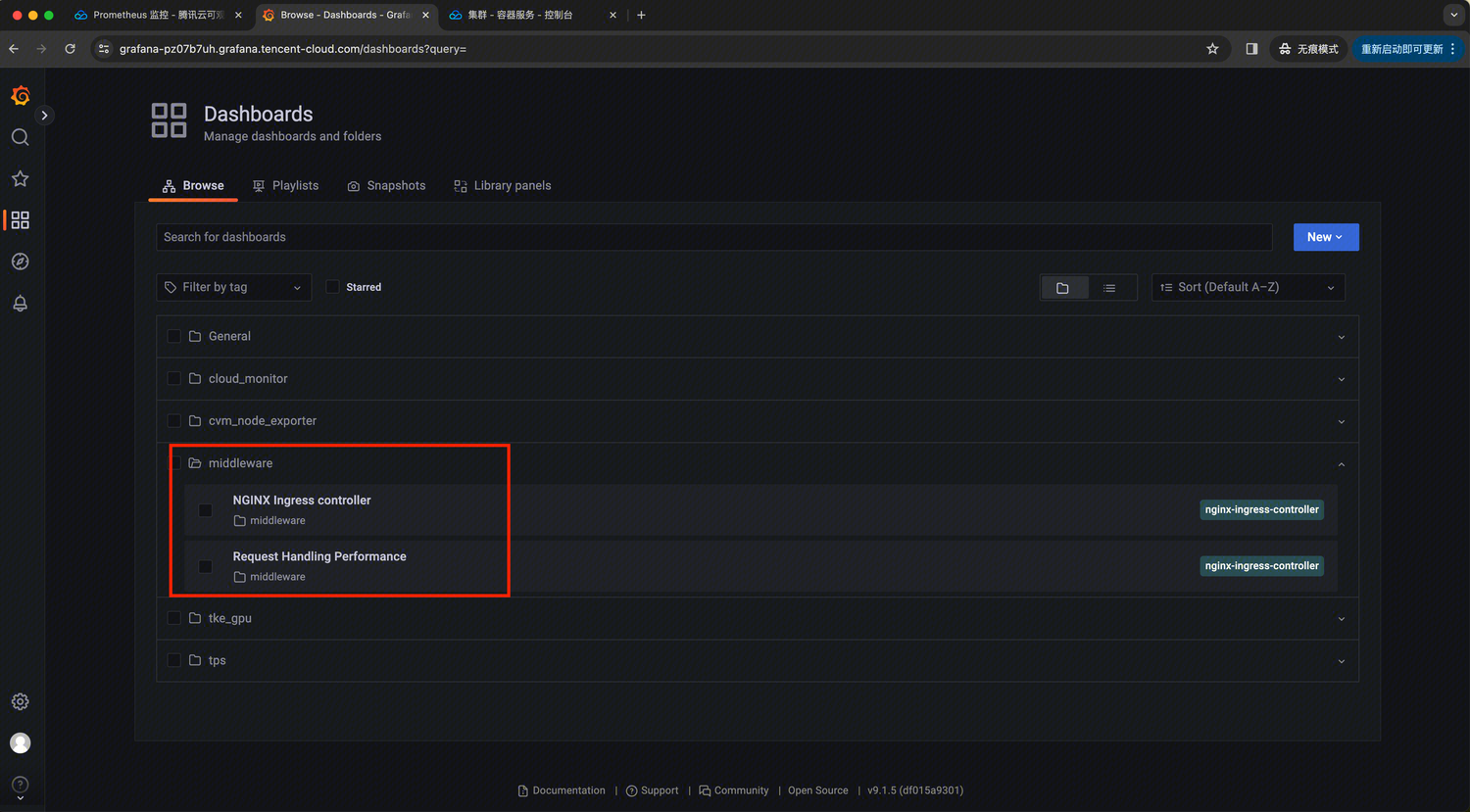 3. 在实例基本信息页面,找到绑定的 Grafana 地址,打开并登录,然后在 middleware 文件夹中找到 nginx-ingress 相关面板,即可观察上述 ingress-nginx-controller 的 dashboards,如下图所示: