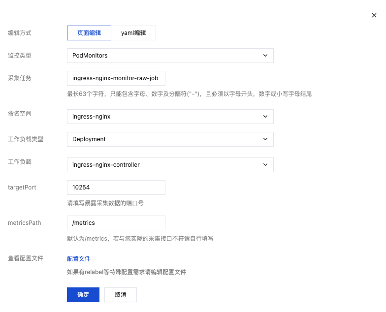 通过控制台的页面编辑能力添加 Prometheus 原生采集配置,选择页面编辑,根据提示填充各配置项。配置完成后单击确定即可,具体示例如下: