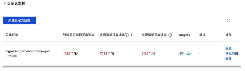 2. 找到步骤二中添加的采集配置(二者选其一即可),查看指标采集速率是否大于0,Targets 是否与 ingress-nginx-controller pod 数量一致且均为 up 状态,如下图所示: