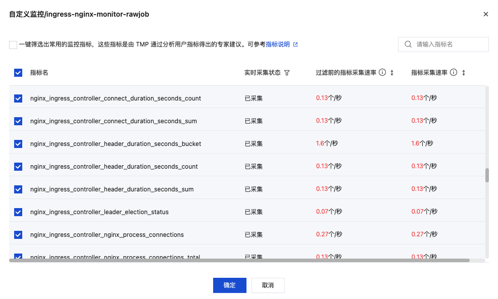 3. 单击采集配置对应的指标明细,可查看指标的采集详情,检查指标列表中包含以 nginx_ingress 为前缀的指标即可,如下图所示: