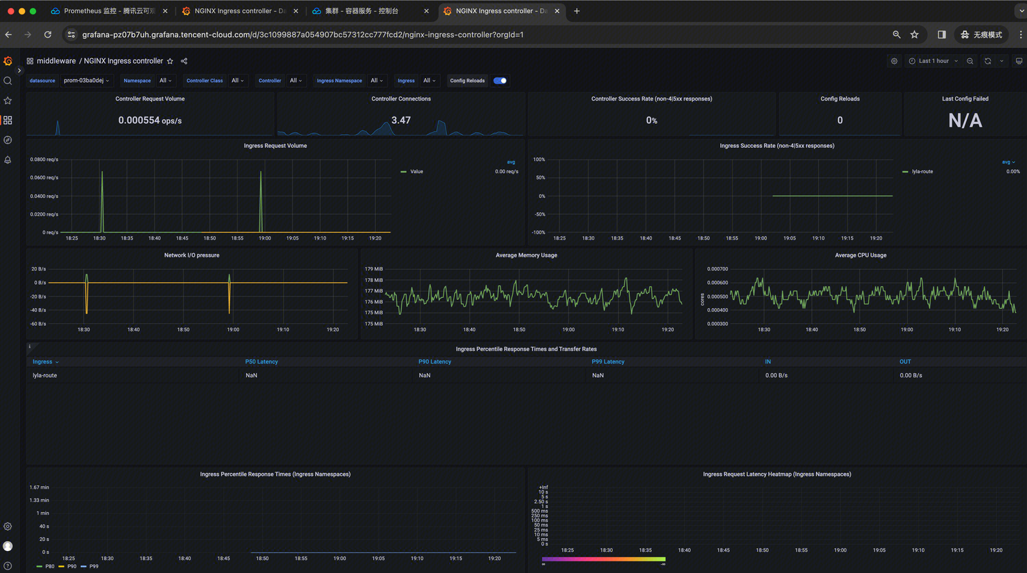 在使用 Nginx Ingress Controller 过程中需要对 Nginx Ingress Controller 运行状态进行监控,以便了解 Nginx Ingress Controller 服务是否运行正常,排查 Nginx Ingress Controller 故障等。腾讯云可观测平台 Prometheus 监控服务提供了开箱即用的 Nginx Ingress Controller Grafana 监控大盘,本文将为您介绍如何使用 Prometheus 监控 Nginx Ingress Controller。