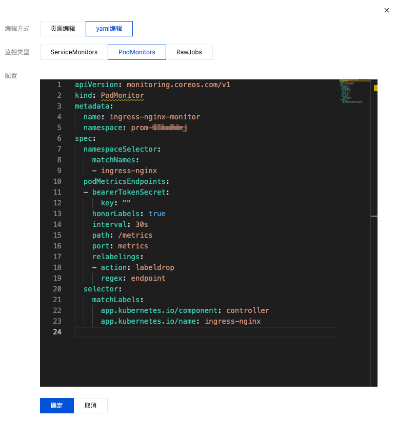 通过服务发现添加 PodMonitors 来定义 Prometheus 抓取任务,选择 yaml 编辑 > PodMonitors,填写 yaml 配置后单击确定即可,如下图所示: