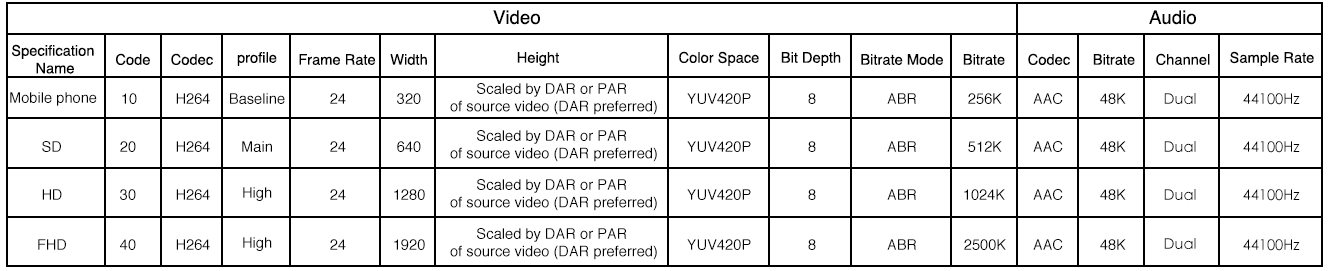如果用户上传的视频分辨率比率同以上比率不一致,那么在转码输出时,将按照宽度对齐以上标准尺寸,高度按照比率缩放的方式输出文件。