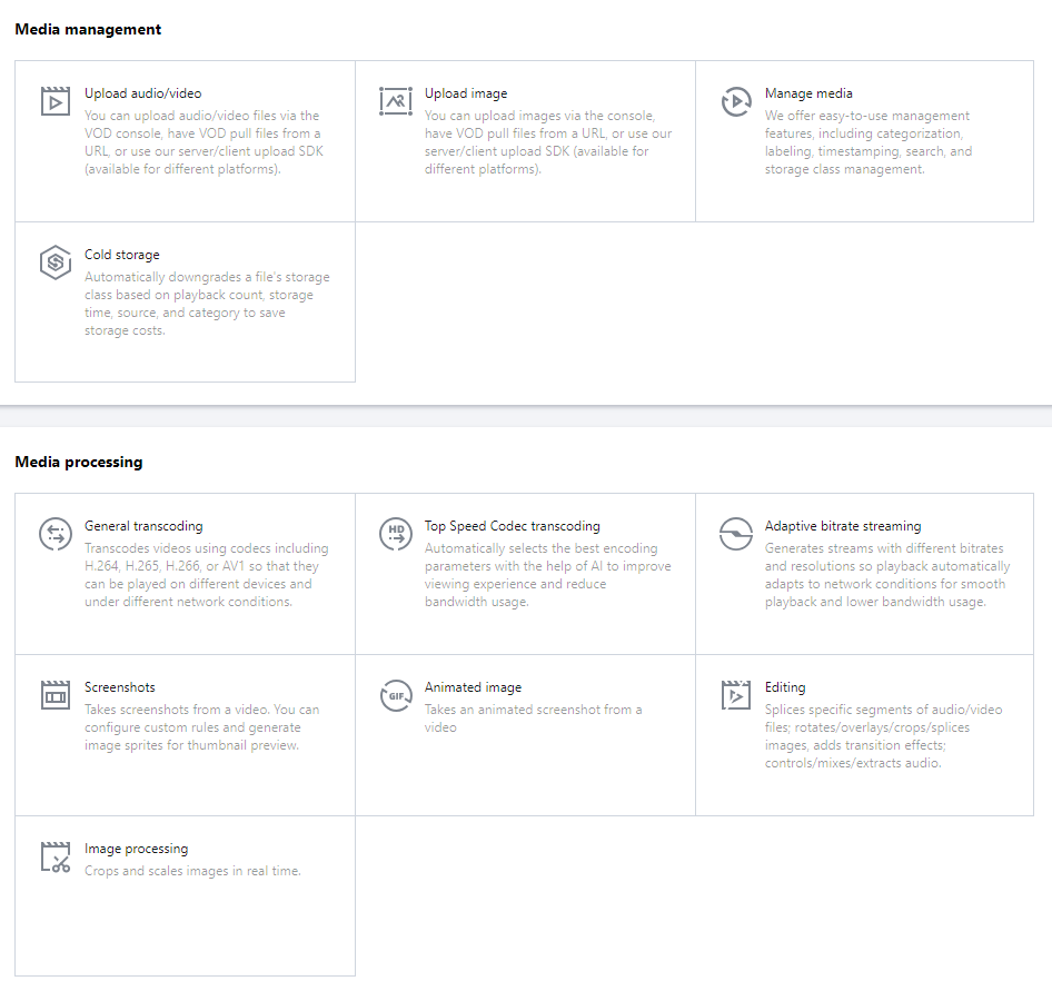 云点播产品使用指引包括媒体智能管理、媒体加工处理、媒体 AI 、媒体加密与版权保护、媒体分发播放、直点播互转等功能使用说明。