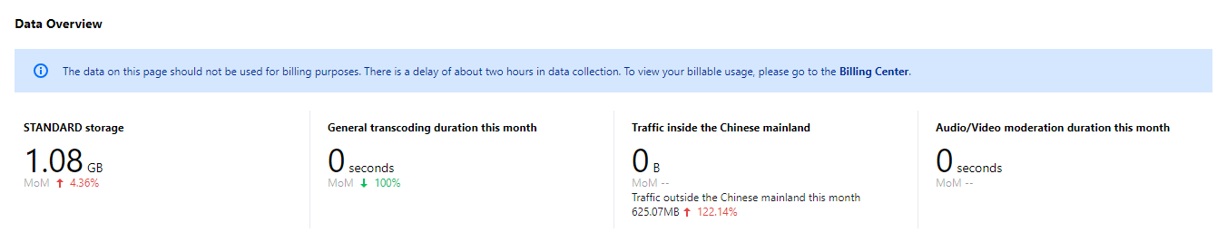 数据概览展示当月使用云点播服务的资源用量信息,包括当前存储空间总量、本月转码总时长、本月流量总量、本月标准取回总量和本月审核总时长。