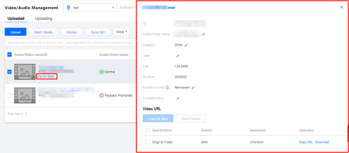 可以复制该音视频的 URL 地址,用于音视频处理和音视频播放等。