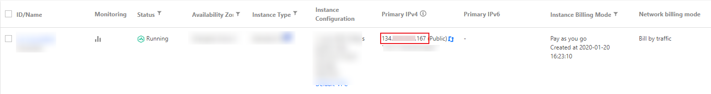 3. 再次进入 实例列表 界面,找到您创建成功的 CVM 示例,并拷贝主 IP 地址中的公网 IP(示例中的 IP 是 134.XXX.XXX.167)。