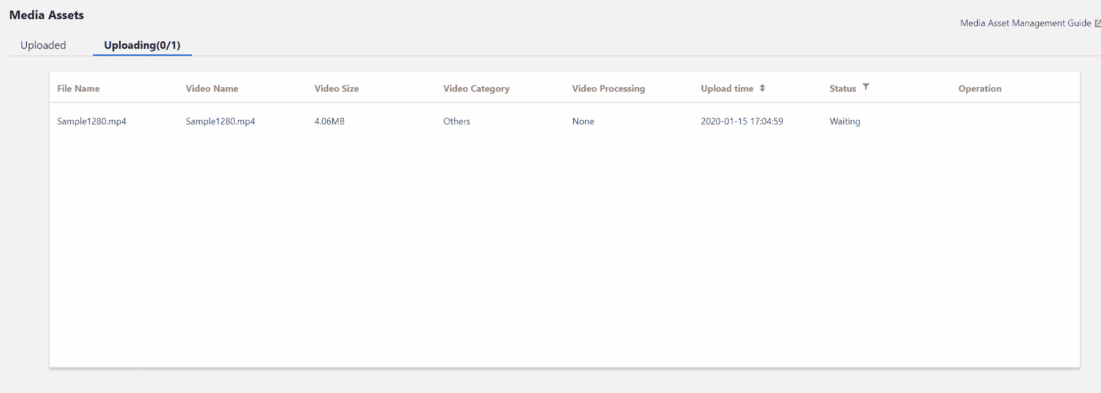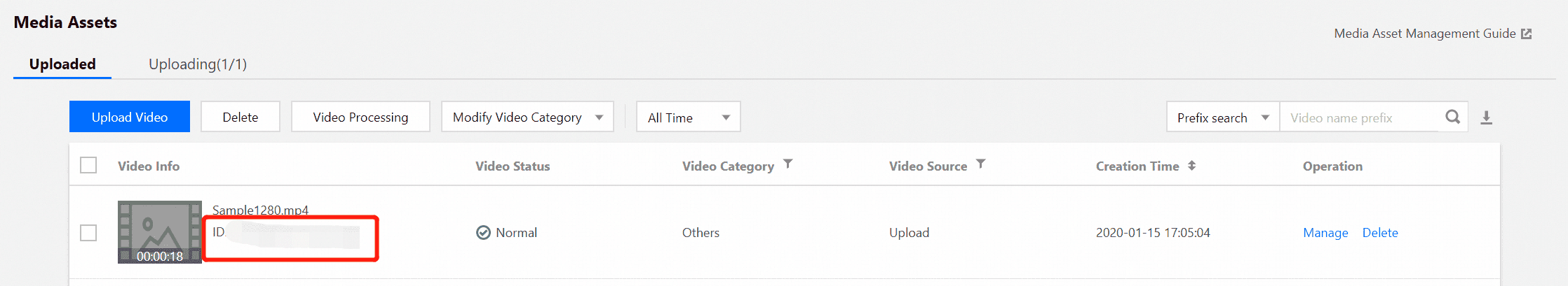 上传完成之后,在“已上传”栏的视频列表中,将看到上传完成的视频,以及视频对应的 ID(即 FileId)。