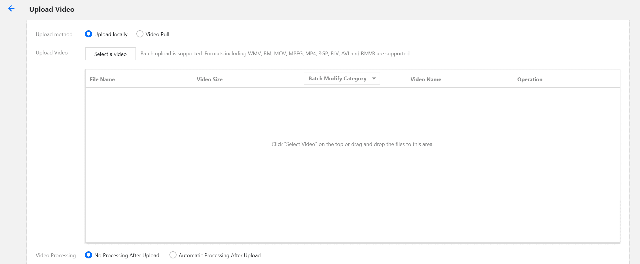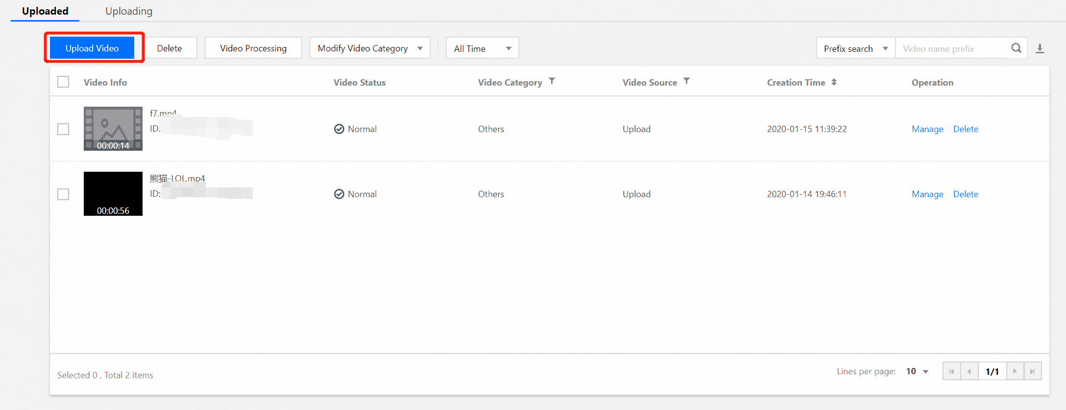 1. 单击左侧菜单栏的媒资管理 > 视频管理,选择已上传,单击上传视频。